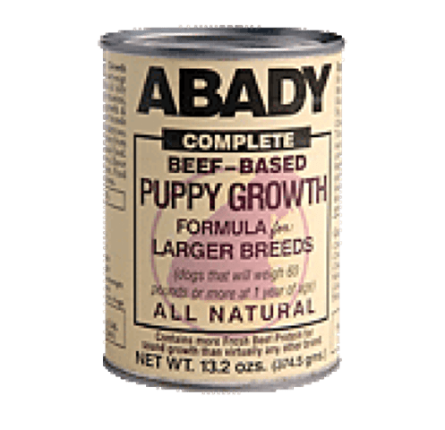 ABADY Complete Beef-based PUPPY Growth Formula for LARGER Breeds (puppies that will weigh over 60 pounds at one year of age) is a complete & fully balanced growth formula containing all the vitamins, minerals & meat protein vital for sound growth & musculo-skeletal development. Unlike other brands containing low-cost, low quality dry concentrates (soy, gluten meals & many grains), Abady's protein comes from fresh meat and internal organs, a dog's natural food. Abady does not contain artificial preservatives, flavor enhancers, coloring agents or stool hardeners. Feed alone or mixed with one of Abady's dry rations.