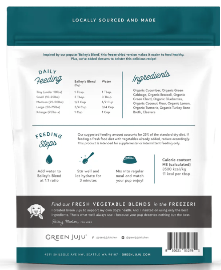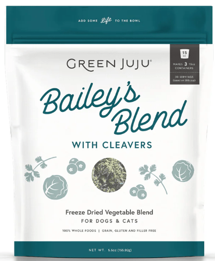 A detoxifying raw nutrient boost for dogs and cats, Freeze-Dried Bailey’s Blend with Cleavers is a fresh twist on our signature blend.