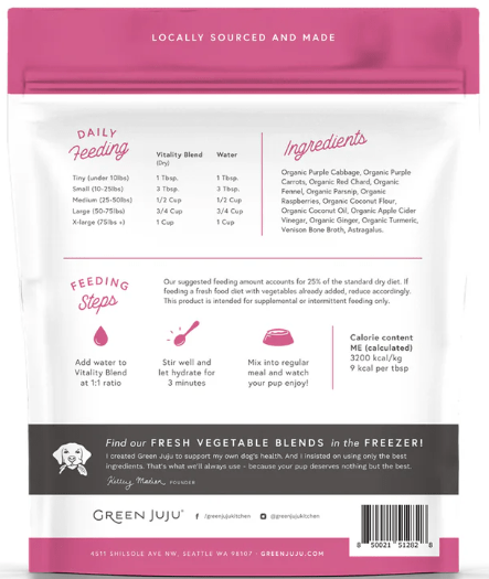 Our Vitality Blend with Astragalus combines the power of vibrant pink and purple fruits and veggies with wild-harvested venison bone broth to support digestion, enhance gut-biodiversity, and stimulate immune health—especially in senior pets or those needing a little extra resilience.