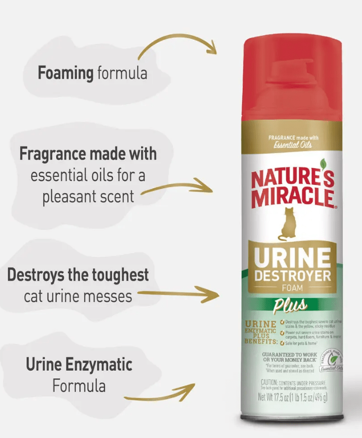 Nature’s Miracle Urine Destroyer Foam Plus for Cats is a fast-acting, deep-cleaning solution specially formulated to tackle tough cat urine messes, right at the source. Designed with a powerful foaming aerosol, it expands on contact to penetrate carpet fibers, cracks, crevices, and other hard-to-reach areas where urine can hide.