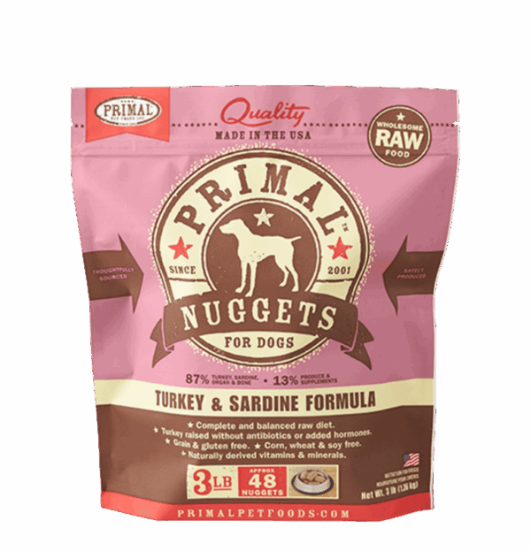 Give your dog a nutrient-rich boost with Primal Frozen Raw Turkey & Sardine Formula, a unique blend of lean, cage-free turkey and wild-caught, omega-packed sardines. This complete and balanced raw diet delivers high-quality protein for strong muscles, along with essential fatty acids that support healthy skin, a shiny coat, cognitive function, and heart health.