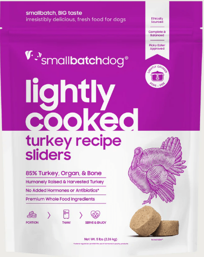 Feed your dog the pure raw way mother nature intended with convenient Frozen Dog Food from Smallbatch! Smallbatch is an independent family-owned company in the Bay Area of California that utilizes local and sustainable sourcing to provide your pet with the very best in raw feeding! Only made with the highest quality organic non-GMO ingredients for the freshest and most nutritious raw meals that your pet will love! Smallbatch's raw diets use a limited-ingredient single-protein formula featuring 78-88% meat, organ and bone. Only made with meat that is humanely USA-sourced and antibiotic and hormone-free. Smallbatch proudly features no mechanically separated meat. All essential vitamins, minerals, and amino acids come from organic wholefood sources. Smallbatch's new Lightly Cooked line offers the same pure raw diet your pets love that is lightly cooked sous vide style that is gentle and easily digestible for sensitive tummies. Each batch is placed in a water bath and gently cooked to ensure pasteurization for sensitive stomachs. Features convenient individual sliders for easy feeding and portion control! Your dog will be licking their lips after tasting theses delicious raw diets! No Root Vegetables. Made in USA.
