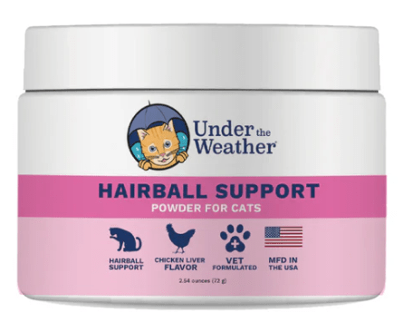 Prevent hairballs and naturally promote gentle elimination. This easy-to-use powder supplement contains psyllium seed husks loaded with fiber to naturally and gently allow hairballs to safely pass through the intestinal tract. Veterinarian-formulated and manufactured in Vermont, Under The Weather's Cat Hairball Support Powder is free of corn, artificial flavors and dyes, and has a great chicken liver taste your kitty will love!